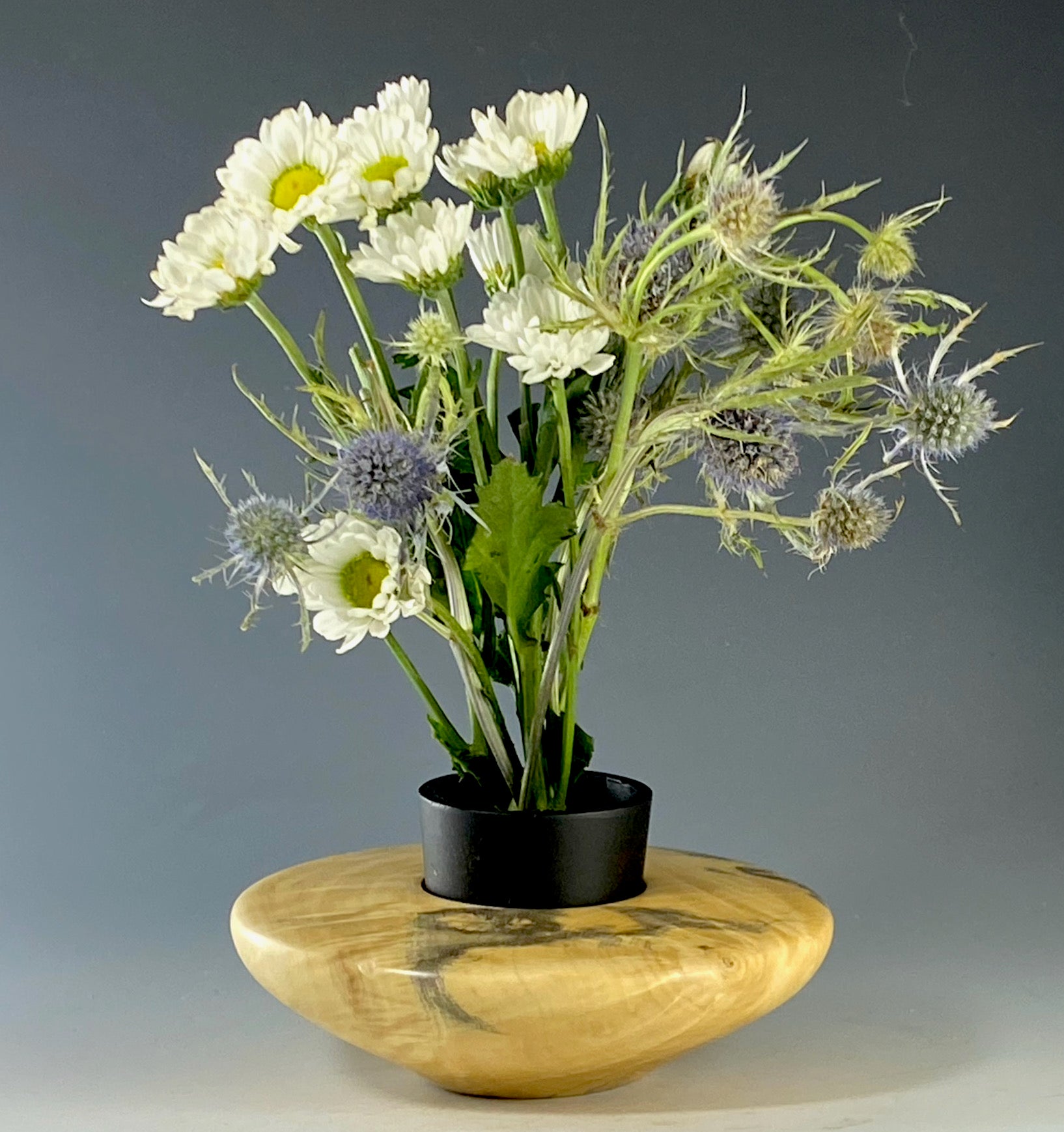 This ickebana, with a water-holding pin barrel, has been turned from Buckeye Burl. Buckeye and related species are native to the eastern and western United States. Much of it comes from California, hence the name of this species. The timber from California and Oregon is not particularly interesting underground, but in its burl (above ground) form, Buckeye more than makes up for this: the wood is soft, with a palette of grays, whites, blacks, and some brown and orange. This all comes from the oxidizing of underground minerals the burl has absorbed. The patterns that are generated by these colors are simply spectacular, like no other burl wood in the world. The variations and shapes in the figure are endlessly fascinating.