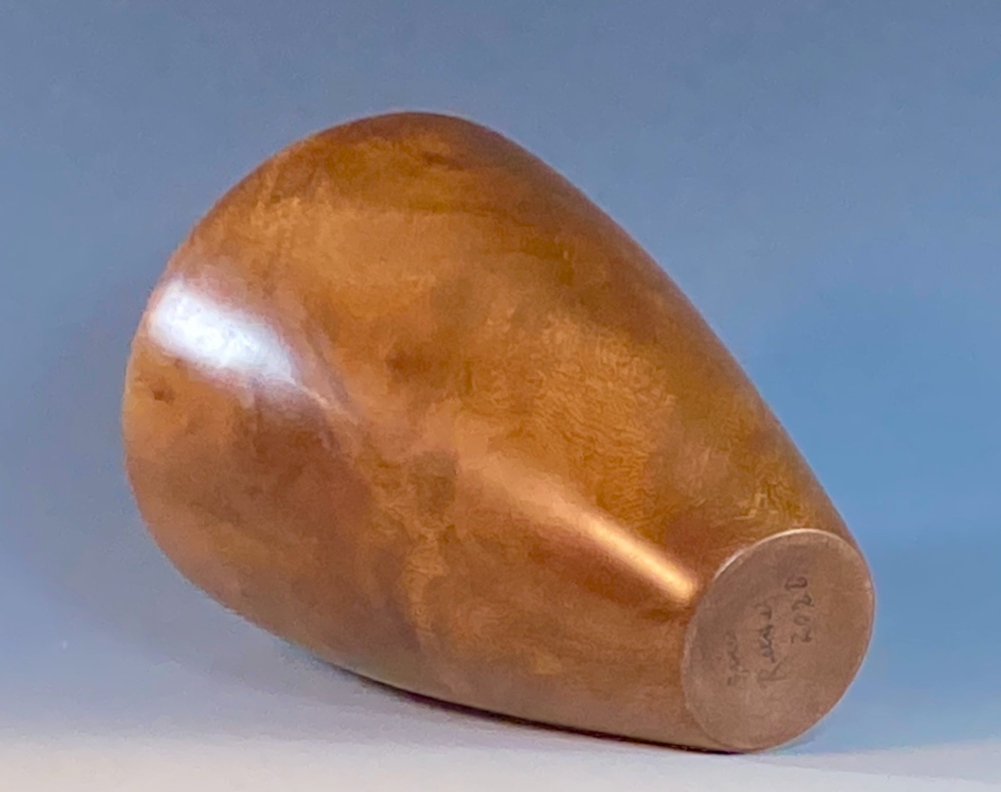 This vase form has been turned from Camphor Burl [Cinnamomum camphora], a truly extraordinary burl wood, coming mainly from Southeast Asia, Vietnam in particular. With a rich, reddish primary color—and others swirling— Camphor Burl is most notable for its amazing figure, rivaling that of even the most impressive burl woods from around the world. It turns extremely well and takes a fine finish, here—after sealing and final sanding—Danish oil is hand-rubbed into the wood. The final step in the finish is the application of a superior mixture of carnauba and beeswax in a gentle solvent. The turning appears lustrous, but without the “depth” of lacquer or other thicker finishes.